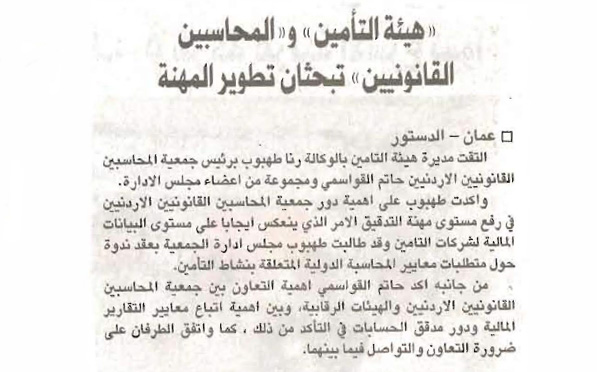 التقت مديرة هيئة التامين بالوكالة رنا طهبوب برئيس جمعية المحاسبين القانونيين الاردنيين حاتم القواسمي ومجموعة من اعضاء مجلس الادارة. واكدت طهبوب على اهمية دور جمعية المحاسبين القانونيين الاردنيين في رفع مستوى مهنة التدقيق الامر الذي ينعكس ايجابا على مستوى البيانات المالية لشركات التامين وقد طالبت طهبوب مجلس ادارة الجمعية بعقد ندوة حول متطلبات معايير المحاسبة الدولية المتعلقة بنشاط التأمين. من جانبه اكد حاتم القواسمي اهمية التعاون بين جمعية المحاسبين القانونيين الاردنيين والهيئات الرقابية، وبين اهمية اتباع معايير التقارير المالية ودور مدقق الحسابات في التأكد من ذلك ، كما واتفق الطرفان على ضرورة التعاون والتواصل فيما بينهما.